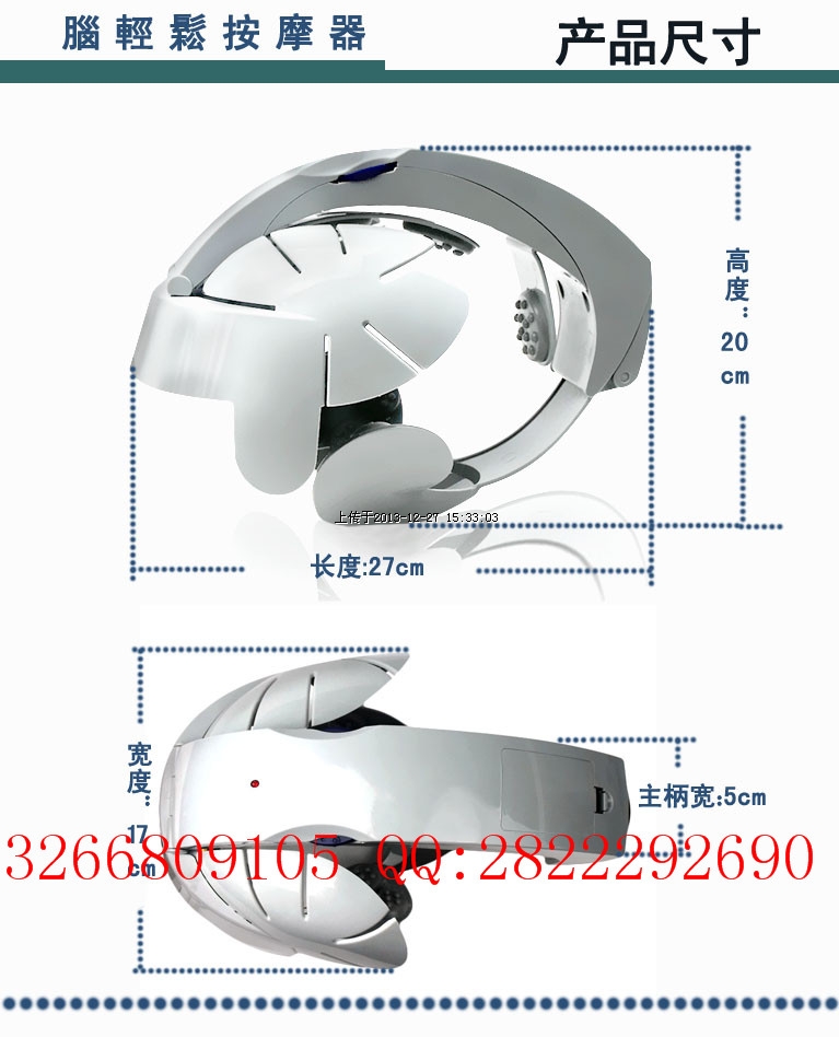 5.『人性化设计』 采用3种外接电源 电源方式:装上三节7号电池、电脑USB接口连接、变压器连接。大小可以调节前端设有松紧装置{固定卡板},根据不同大小的头型,进行针对性按摩。 8种按摩力度可以调节。后端采用释缓设计,方便取下按摩器,穴位点采用高级医用乳胶柔软。 卓越的保健效果无论你在办公室还是家庭还是出游,都可以随时按摩和缓解疲劳酸痛,对头痛、工作疲劳、改善睡眠、提高记忆、缓解脑部疲劳、提供工作质量显著效果,让你作工思维更敏捷,办事效率更高,通过对大脑的保养,使你的事业更上一层楼,是送礼和白领,学生的最佳伴侣。 中医学认为:头是诸阳之会。清静之府、五脏六腑精华之血,清阳之气,皆上注于头。头又容易被邪气所侵袭,当头感受到各种内外邪气之后,或当完成紧张工作之余,都会出现头痛,疲乏、失眠等诸多症状,因此头部保健是极为重要的。 头部按摩对大脑有健康安神,聪耳明目的作用。按摩同时还能改善头部的血液循环,提高大脑的摄氧量,有益于大脑皮质的功能调节,对益智健脑,增强记忆、缓解疲劳、消除紧张、焦虑,使大脑重新获得充足的经理和体力有益处,头部按摩,还对防止失眠、耳鸣、耳聋、目眩等有较好的辅助治疗作用。