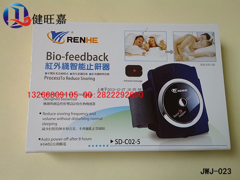 腕式电子止鼾器是一项采用生物回馈的自我训练模式。来降低或减少打鼾行为的一种物理康复仪器。它的过程是透过止鼾器上的微型生物声频侦测器,在侦测超过70+5dB的鼾声10=1秒以上,控制IC即启动脉冲输出机制,以温和的可调的电子针灸方式,透过皮肤送达运动神经,再不吵醒使用者的前提下,促使使用者因反射作用产生变换睡姿,达到抑制和减少打鼾的功效。本品还有省电功能设计,当超过30秒以上侦测不到鼾声时,则自动关机。而累积使用8小时以上即自动关机。只要持之以恒地使用本品,就能达到满意的效果。