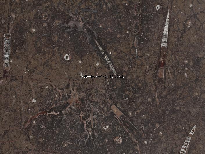 五月棕,是一种特色石材,底色为简单的棕色,没有亮丽的色彩也没有光鲜的点缀,但其纹路有如同丰富多彩的宇宙,星河灿烂,变化莫测。长短不一的海螺化石毫无拘束地排列着,似乎在游动,赋予了其生命,同时也使其充满了历史感和神秘感。