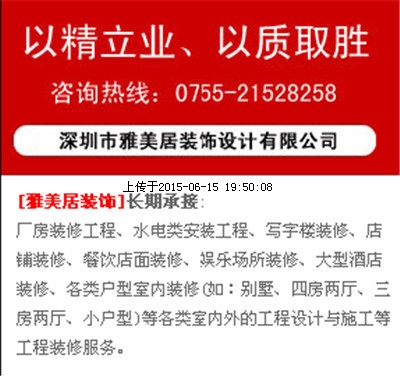 雅美居深圳罗湖装修公司成立于1996年,为您提供各种装修服务;公司写字楼,厂房,办公室,办公室,别墅,房屋装修,居家,店铺,专卖店等完善的企业管理、优质的工程质量、高素质的员工队伍、在设计、施工、监理、材料配送建立了高标准的服务体系!在装饰装修行业具有较高的声誉。雅美居装饰公司愿与各界朋友真诚合作,为您的工作、生活创造温馨、健康、舒适的环境而不断努力!价格实实在在!质量精益求精!服务不分昼夜!信誉诚信可靠力造品牌企业!为客户提供更完善的服务 !
