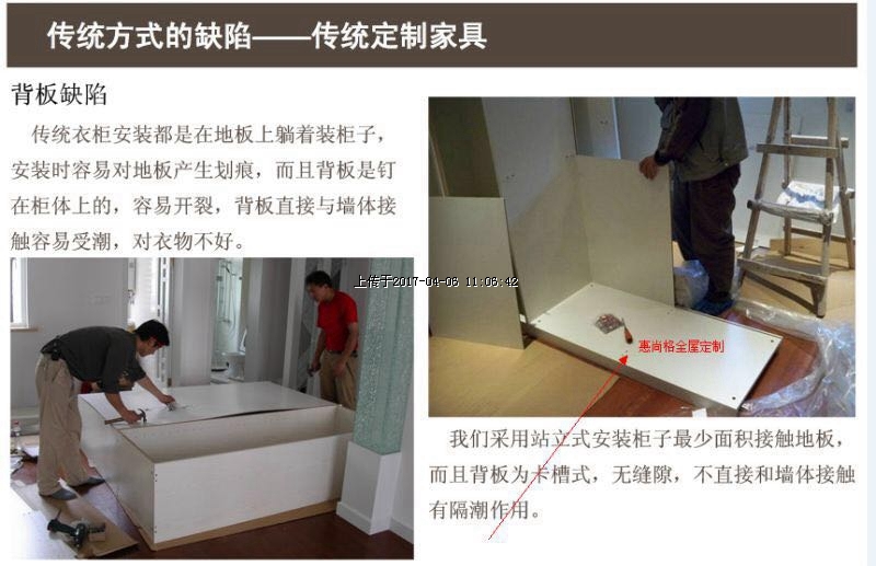 H.S.G的所有的柜体均采用9MM背板开槽技术,,不要一颗钉子,抗压性强,便于拆装。更能忍耐潮气,而不变形。同时可以反复拆装N次,使你的衣柜经久耐用。一次到位。