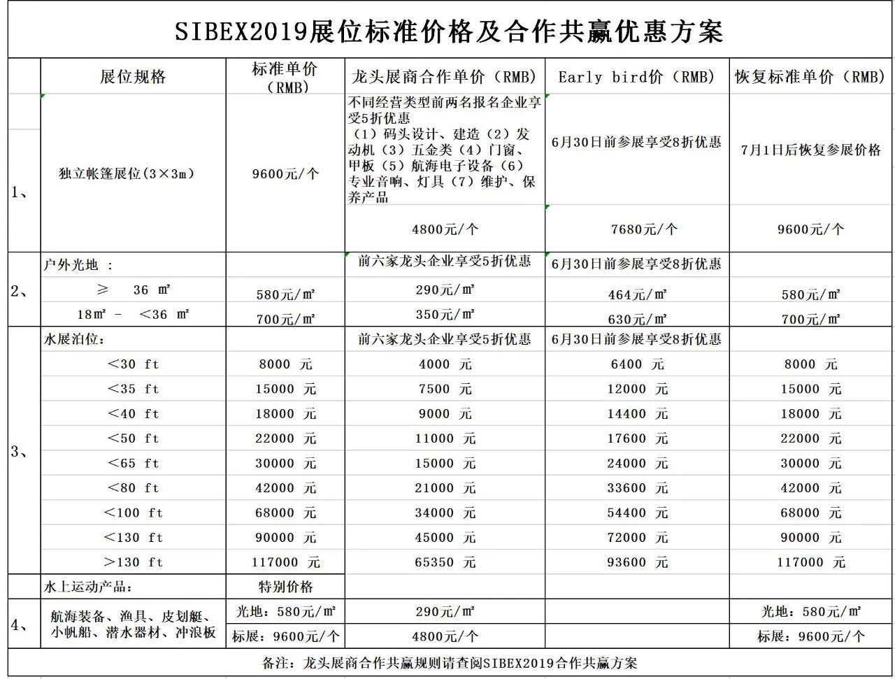 推出2019SIBEX与龙头展商合作共赢方案以及Early Bird参展优惠方案 ,大大降低企业参展成本,扩大参展规模,营造良好的现场气氛(具体方案见下表):