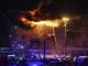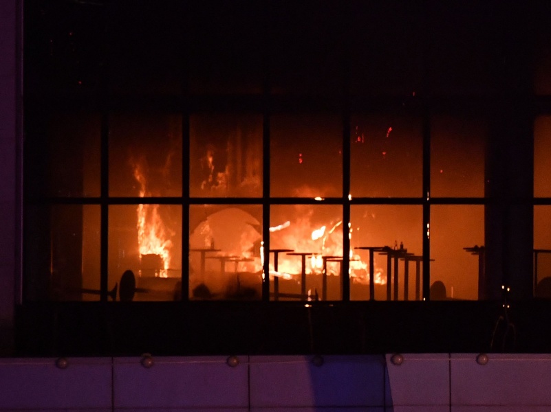 大火引致音乐厅屋顶倒塌,浓烟升上半空,当局出动直升机扑救大火。