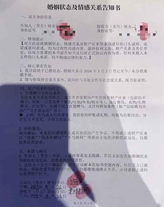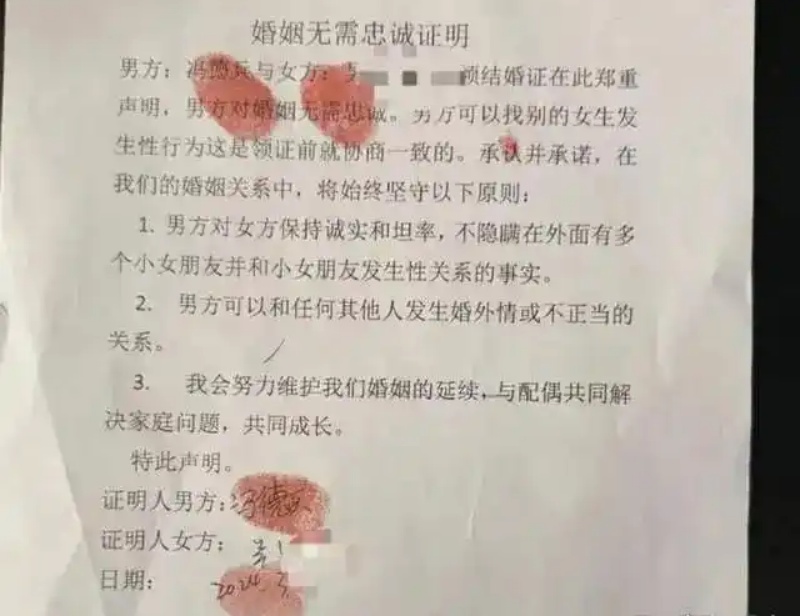 冯德兵还和妻子签订「婚姻无需忠诚证明」合约,协议里白纸黑字写着:冯德兵可以任意搞婚外情,但会履行丈夫义务,女方也签字画押。事后自称冯德兵妻子的帐号在群里自曝,她日前察看冯德兵手机后发现大量婚外情资料,在得知冯德兵疑似与多名女子育有6至7名子女后,自己忍无可忍,才曝光丈夫冯德兵和他200多个情人的细节,并透露现正办离婚手续。