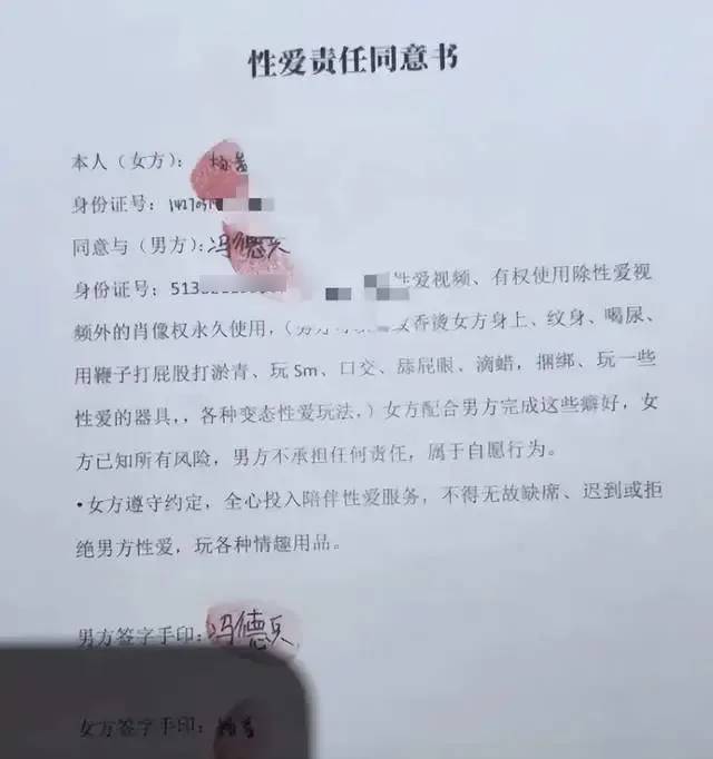 小米公司前总监冯德兵,近日爆出婚外情丑闻,被妻子爆料,指冯德兵包养网红美女、学生妹,先后与超过200位女子签下超过200份「包养合同」、性爱同意书及婚前协议,内容涉及SM细节、无套条款、出勤制度及每月支付金额等,其中多是女留学生,冯德兵给每个情人包养费高达每月10万元人民币,女方要满足男方各种SM癖好,包养3天服务费百万人民币等。