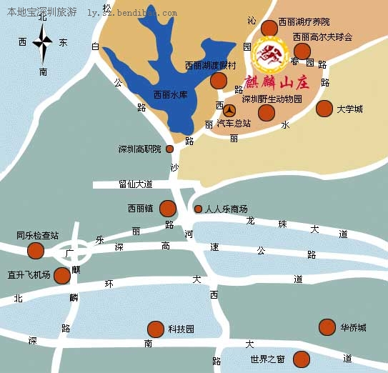 从机场出发:乘327路大巴至“世界之窗站”,进入“世界之窗”地铁站,转乘66路或B797路车到“麒麟山庄疗养院”,步行300多米即可到达。