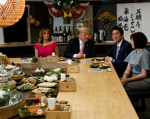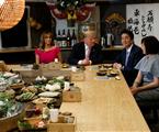 六本木的炉端烧店是东京一家富有日本传统特色的餐应,该店在柜台上陈列鱼虾、肉类和蔬菜,并为顾客当面烤制食物,有许多外国人光顾。特朗普夫妇在安倍夫妇陪同下,在六本木的炉端烧店共进晚餐。 特朗普和第一夫人梅拉尼娅分别接过厨师烤制的食物。